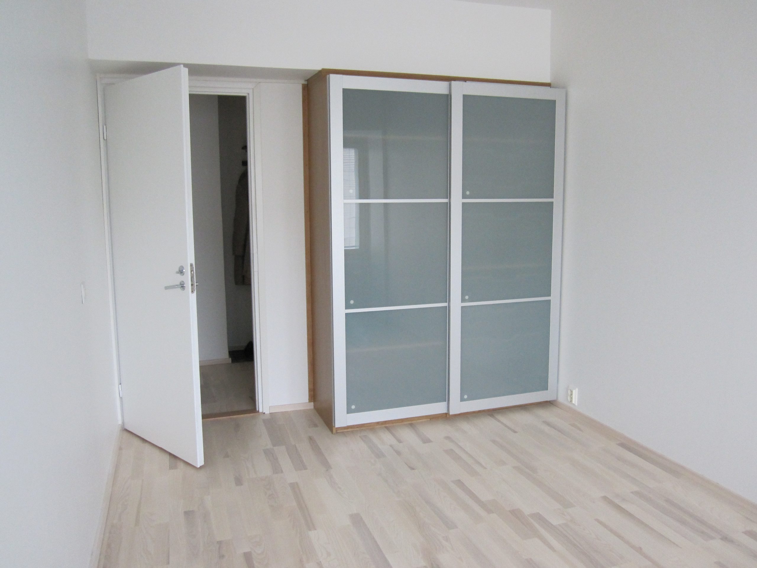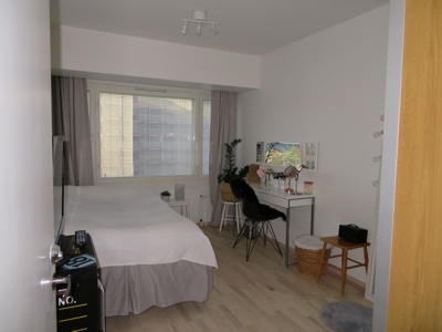 Asunto on valoisa ja selkeäpohjainen. Parveke on lasitettu. Lattiamateriaalit ovat mattavalkolakattu saarniparketti ja eteisessä sekä kylpyhuoneessa keraaminen laatta; seinät valkoisiksi maalatut, kylpyhuoneessa valkoinen kaakelilaatoitus. Suurissa ikkunoissa sälekaihtimet.