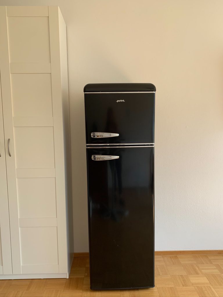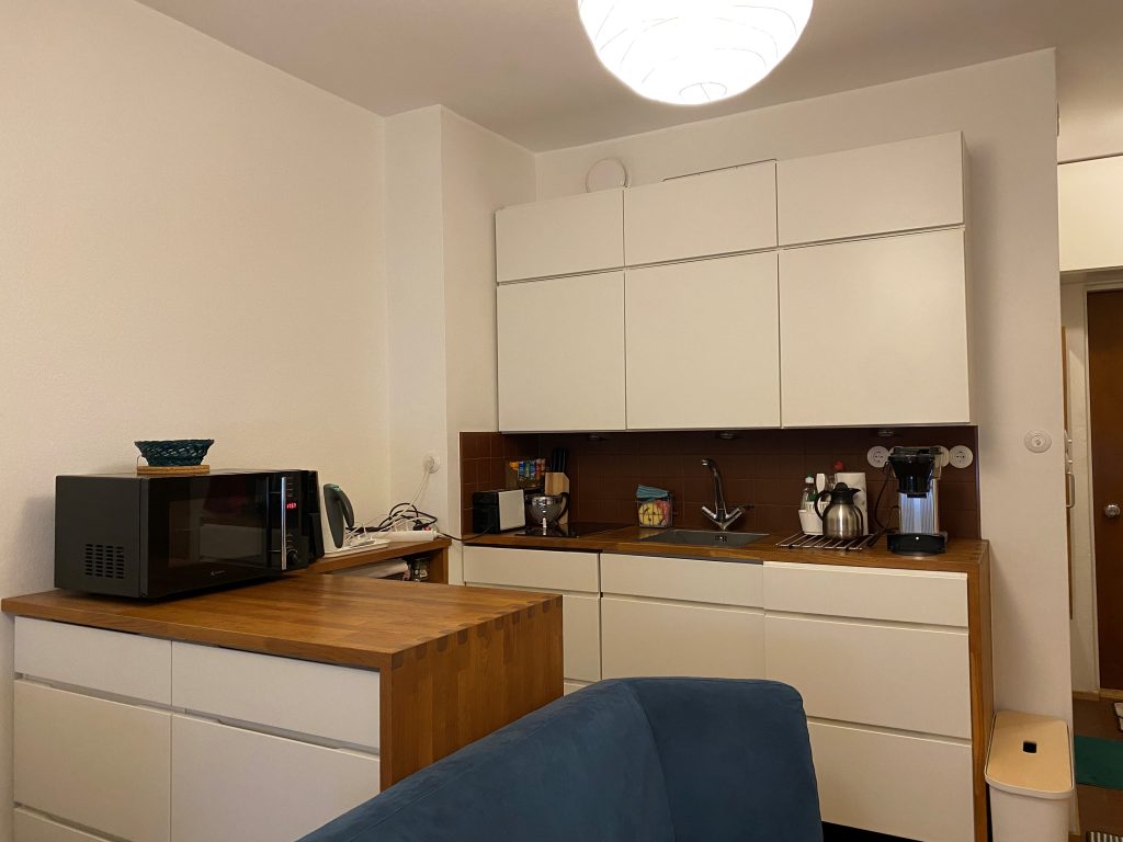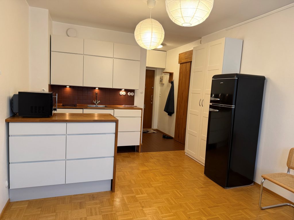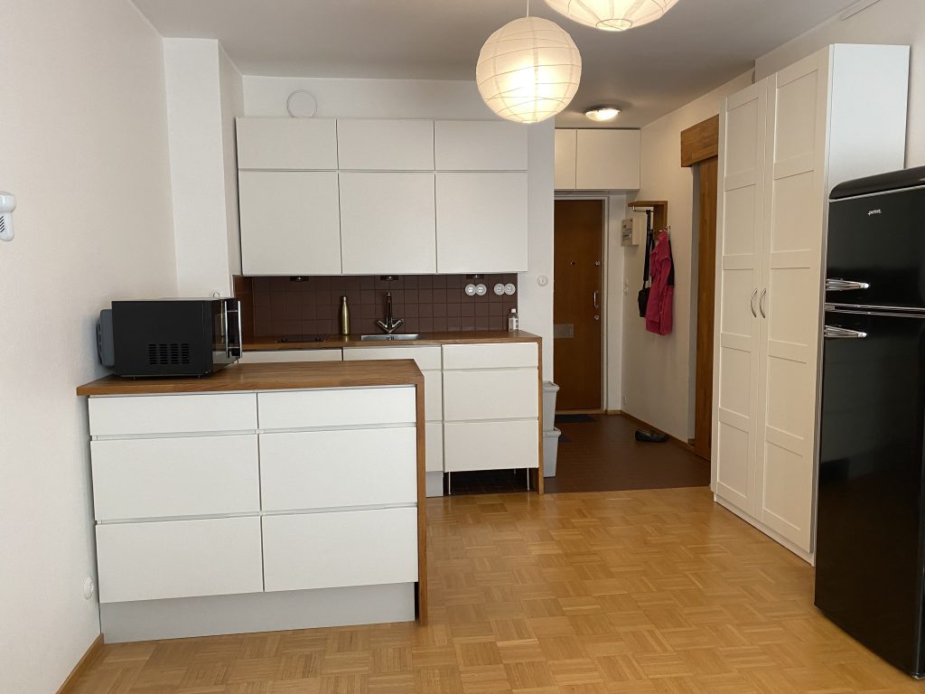 Kauniissa valkoisessa designkeittiössä on massiivitammitasot, integroitu Siemens-astianpesukone, retrotyylinen musta jääkaappipakastin sekä Alessin hana. Keittiössä on keraaminen liesitaso ja kompaktin kokoinen yhdistelmäuuni: kiertoilmauuni/mikroaaltouuni/grilli.