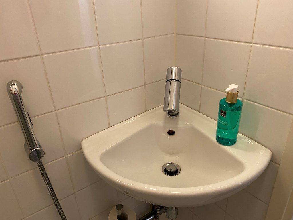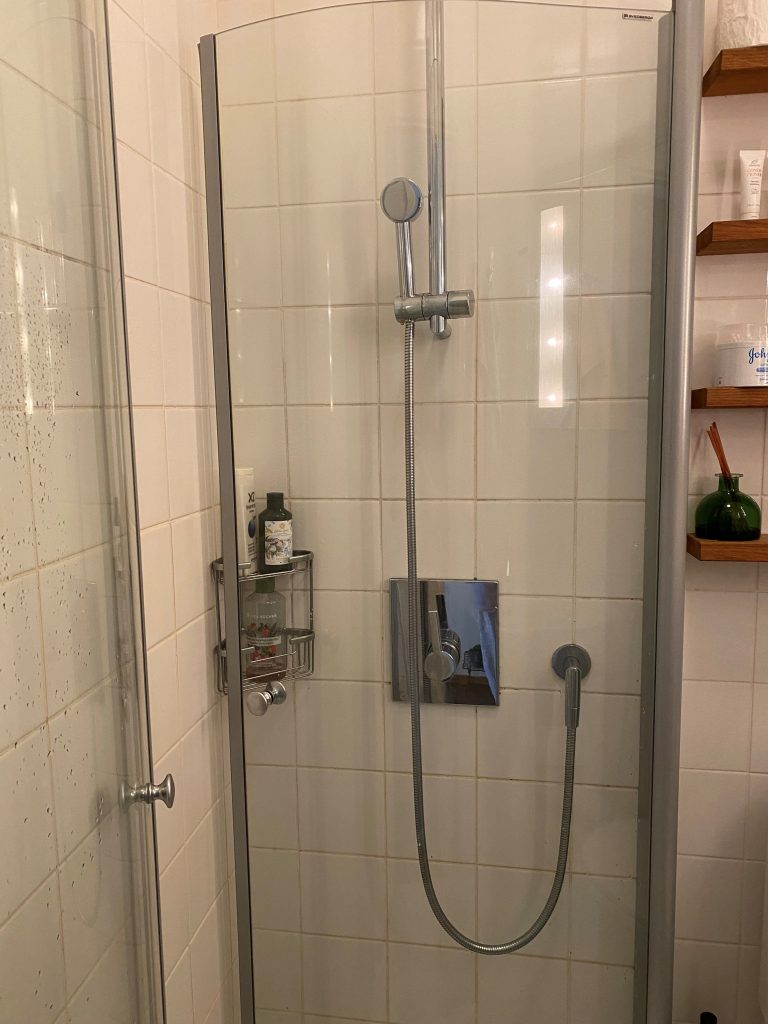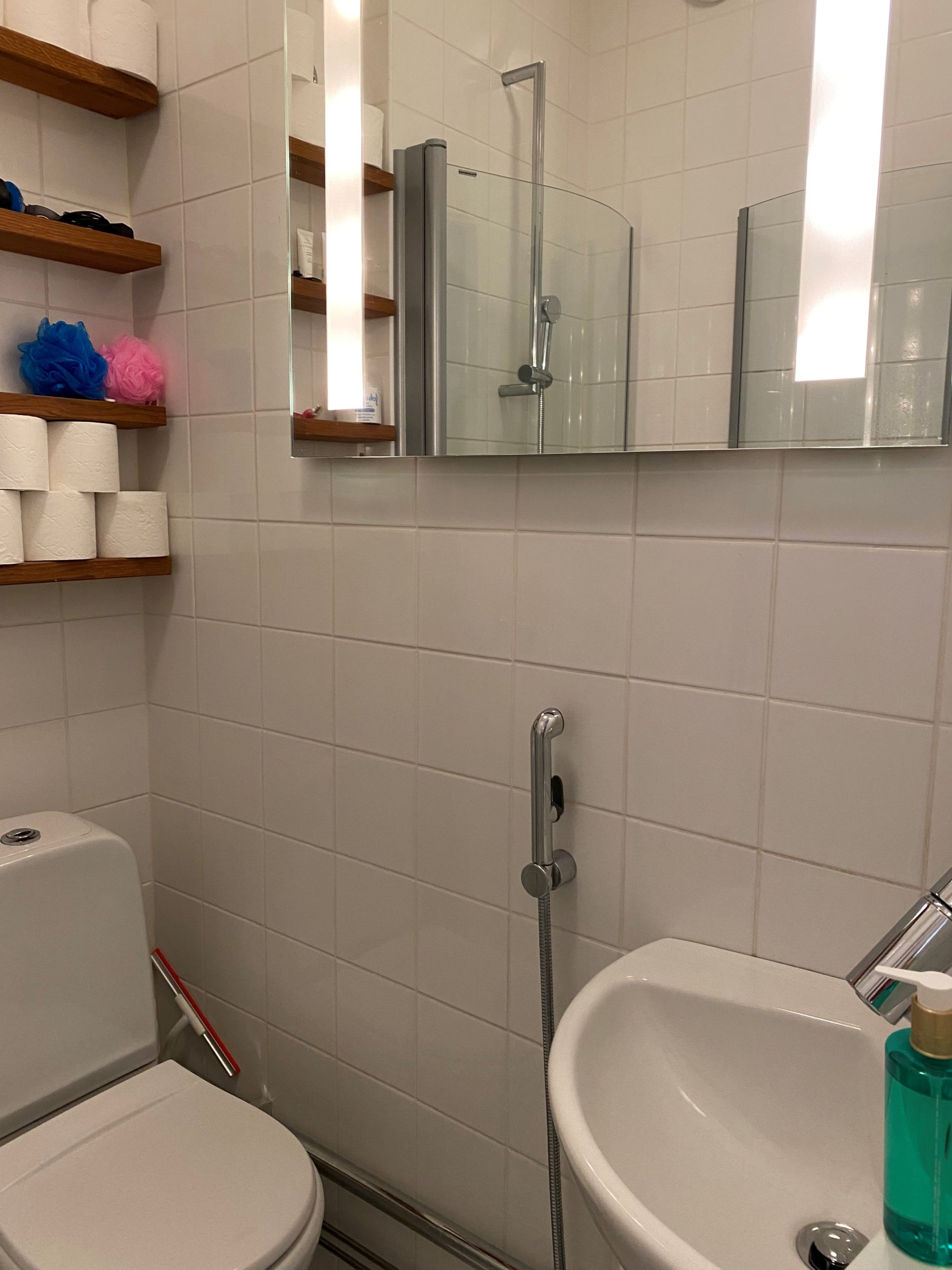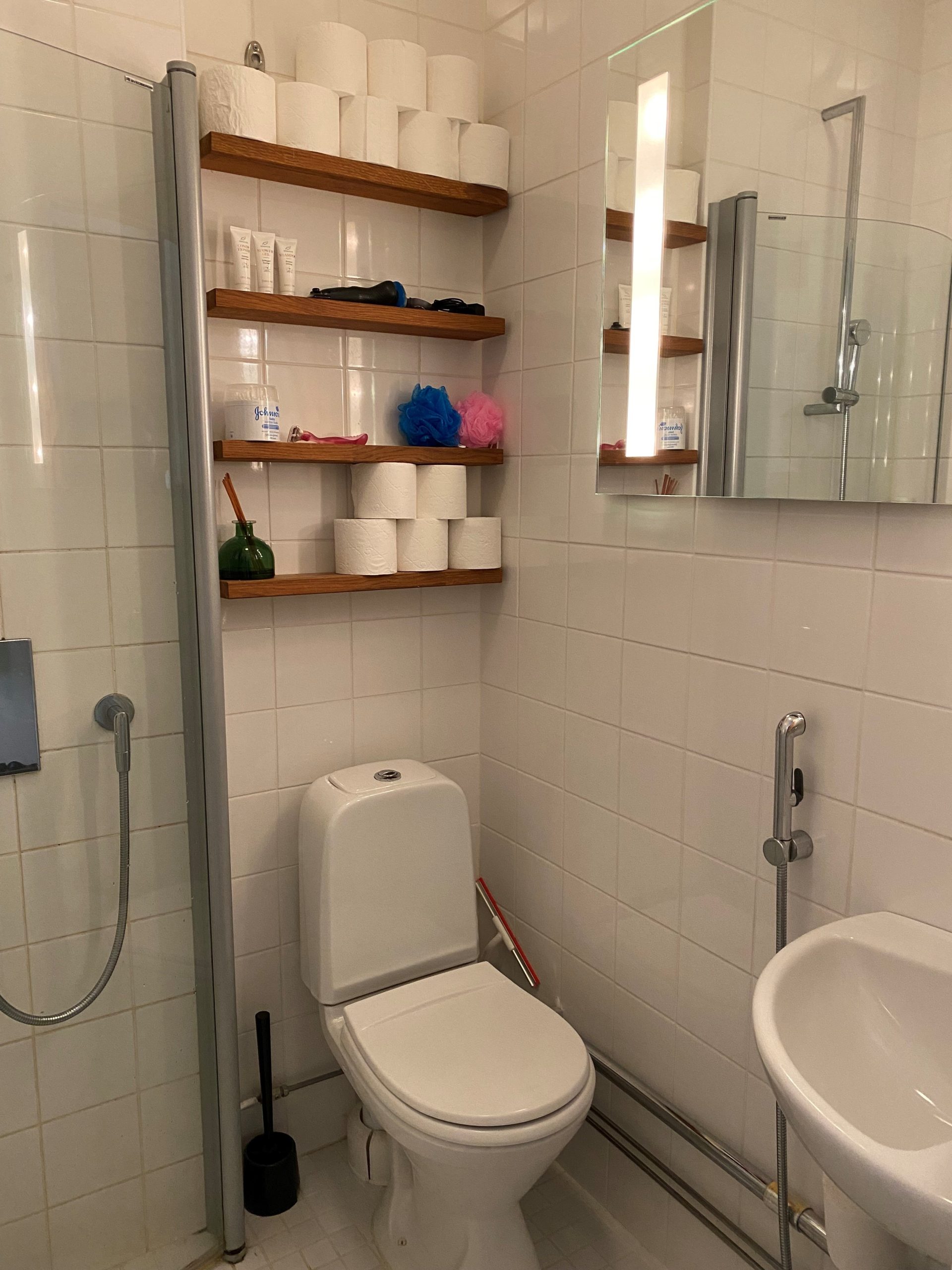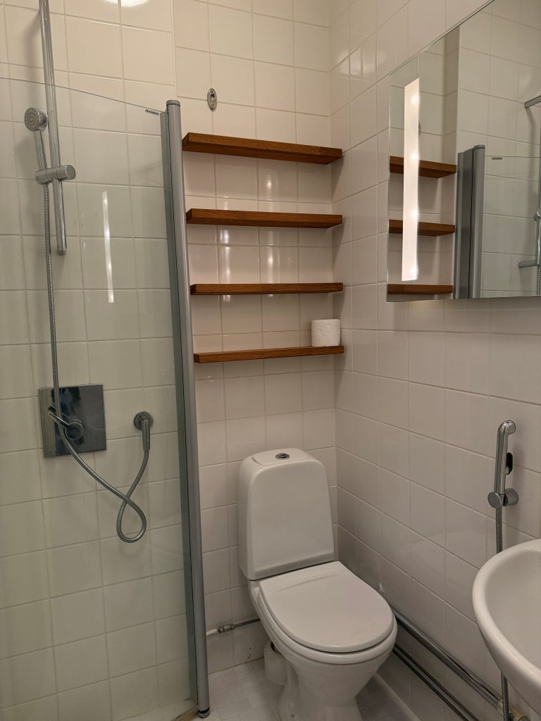 Kauttaaltaan laatoitetussa kylpyhuoneessa on valopeili, tammihyllyt, Alessin hanat sekä taitettavat tilaa säästävät suihkuseinät.