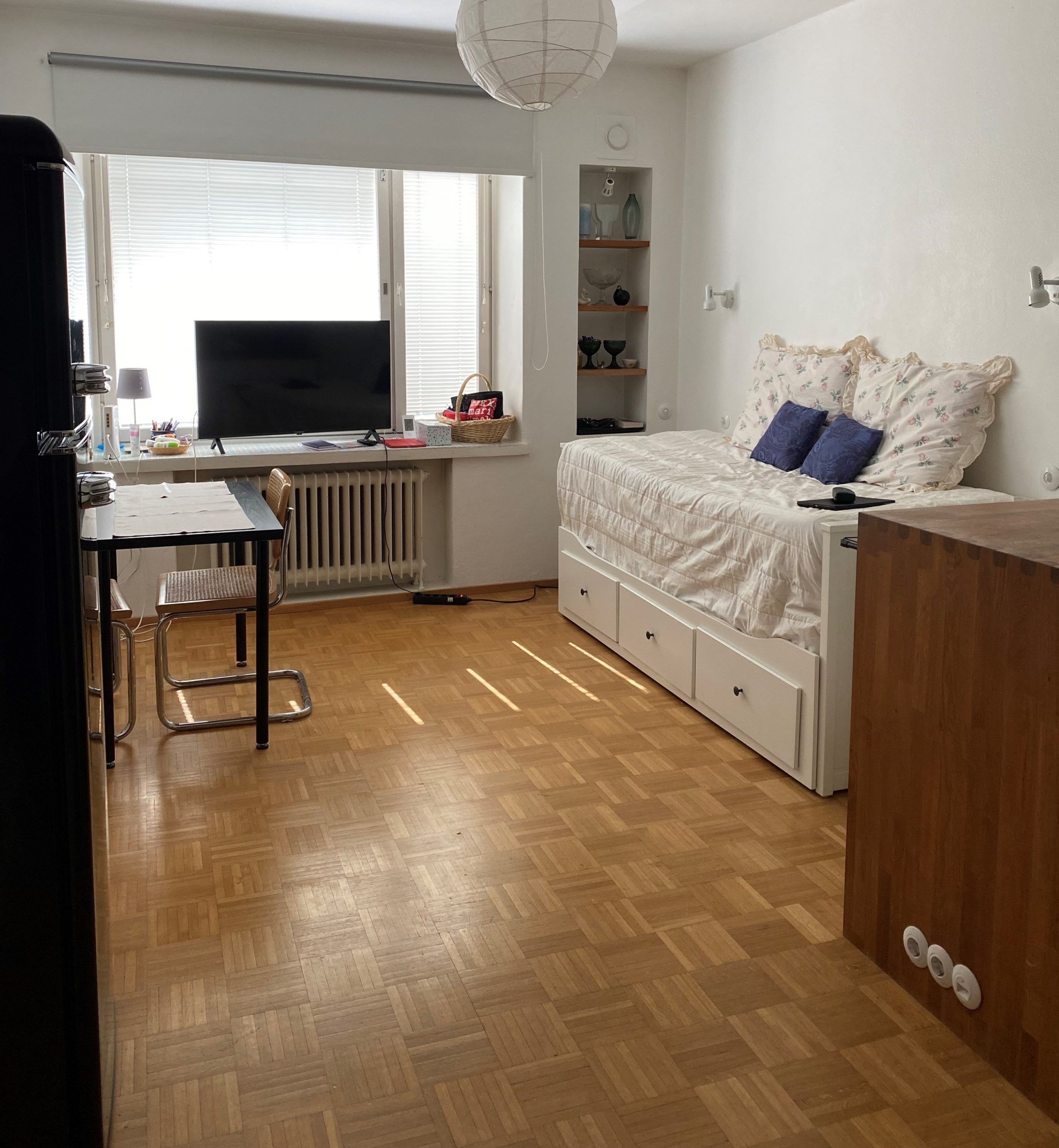 Asunnon seinät on maalattu puhtaan valkoisiksi ja leveä ikkunalauta laatoitettu valkosävyisin lasimosaiikkilaatoin. Asuinhuoneessa on tammimosaiikkiparkettilattia, eteisen lattia on laatoitettu.